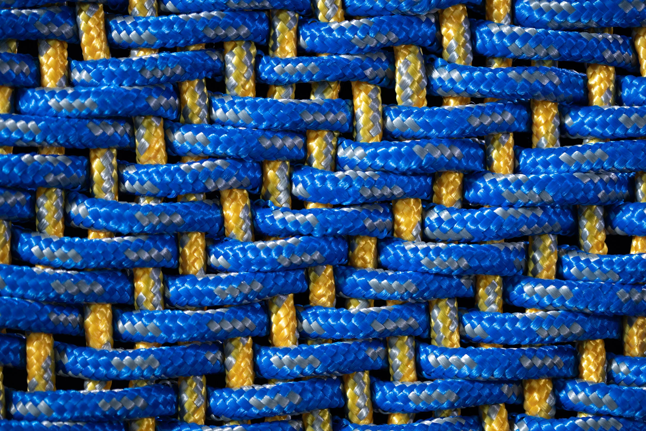 “Charmeuse” means the silk fibers are woven in a satin pattern, in which the weft yarns run typically in a 3-over, 1-under pattern through the warp yarns (shown here with thick rope so you can see the pattern). Satin weave fabric has a smooth, satin-feeling side, and a rougher back side. Naturally we put the smooth side towards your face.